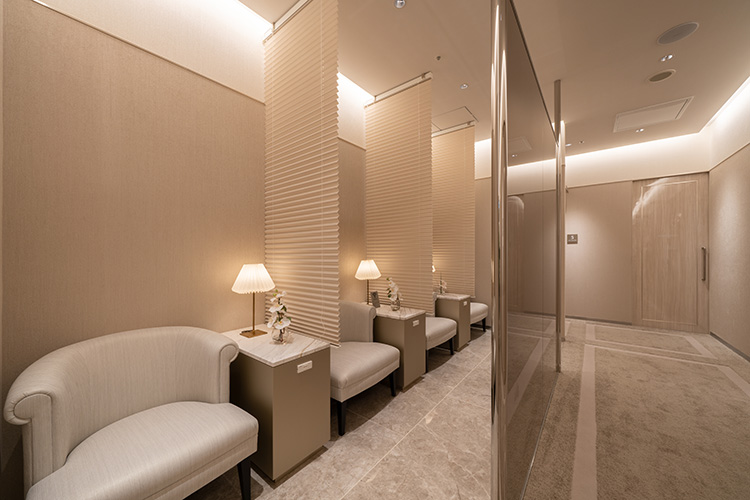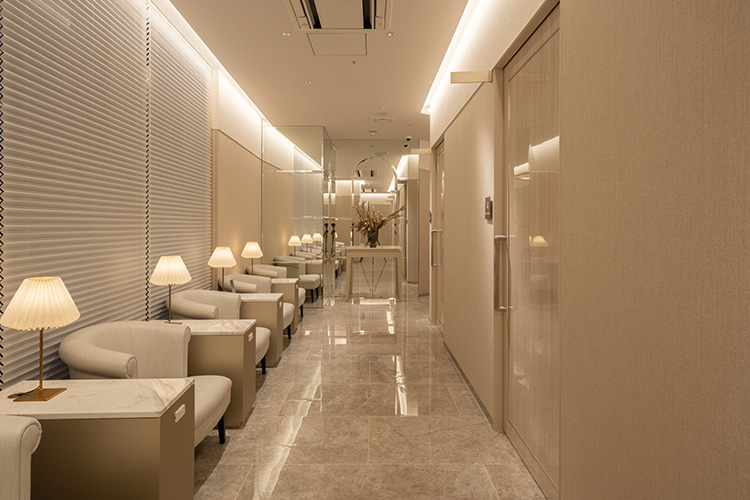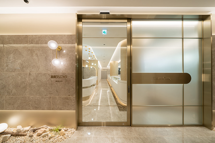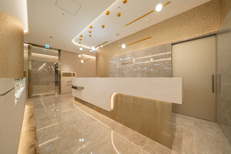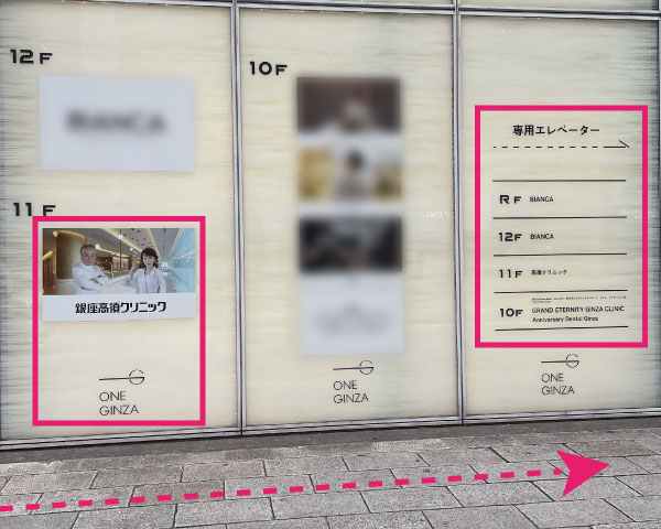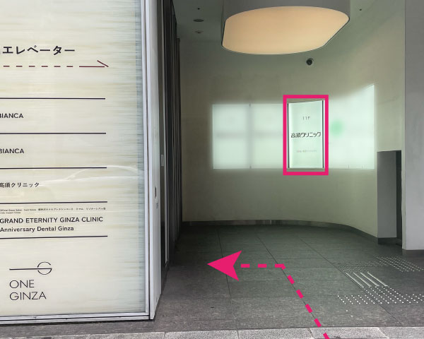 左側を向くとONE GINZAの壁にご案内があります。銀座高須クリニックはこちらの専用エレベーターからお越しいただけます。