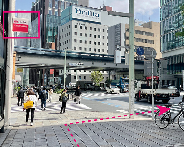 少し進み三菱UFJ銀行の看板が見えたら右に曲がり横断歩道を渡ります。