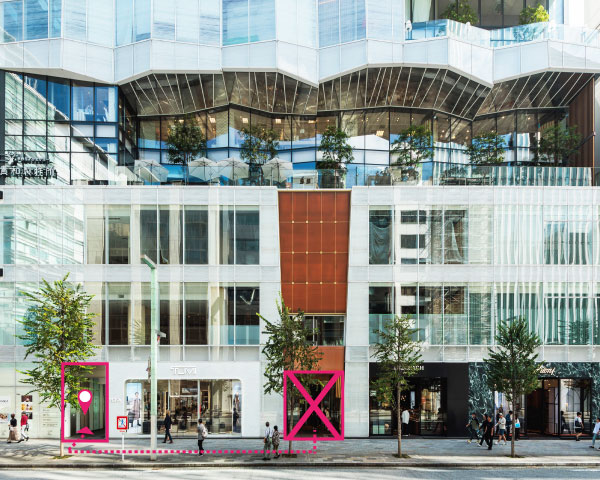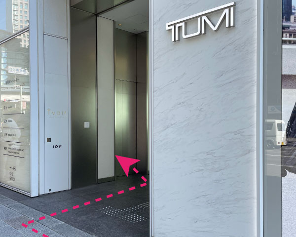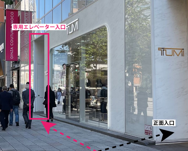 そのまま直進するとONE GINZAのビルが右手に見えます。正面入口を通り過ぎて専用エレベーターがある入り口に向かいます。