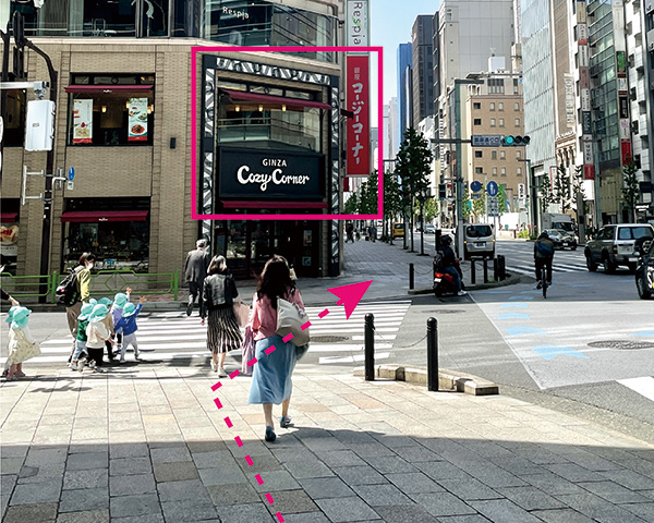 コージーコーナーが見えてきたら正面の横断歩道を渡ります。
