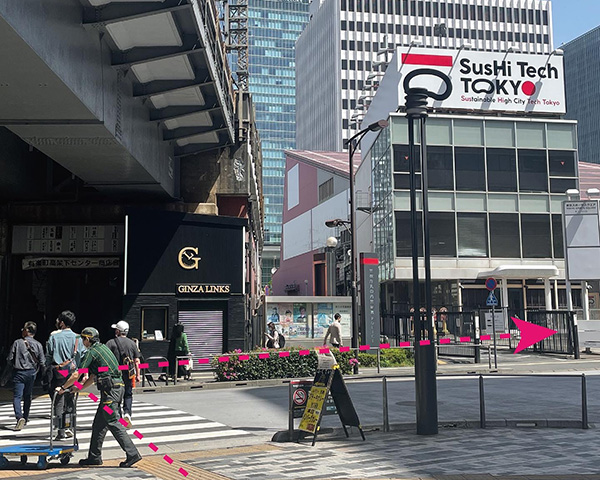 正面にある横断歩道を渡りSusHi Tech Tokyoの前を真っ直ぐ進みます。