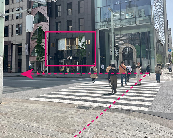 大通りに出たらUGGがあるビル側の道の方へ横断歩道を渡り左に進みます。