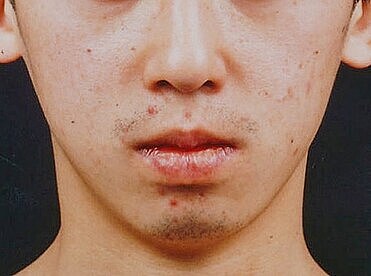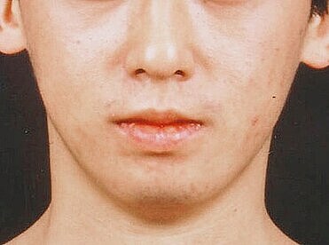 貧弱なあごに大きなプロテーゼを入れ、男らしいあごにした男性の症例。