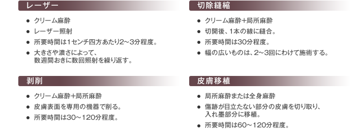 入れ墨、タトゥーを除去する治療法は主に、レーザー治療、切除縫縮手術、剥削手術、皮膚移植手術の4つがあります。