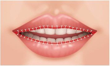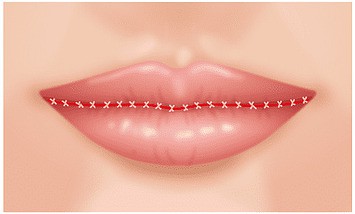 口唇縮小手術は、局所麻酔注射をして、乾いている唇と濡れている唇の境目辺りの粘膜と組織を切除して縫い合わせる手術です。
