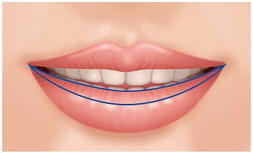 唇を薄くする手術は、唇の表面の乾いている部分と口の中側の濡れている部分の境目を中心に、余分な粘膜と粘膜下組織のボリュームを切除して縫合します。
