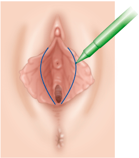 小陰唇の切除すべき余分な組織をデザインペンやピオクタニン(デザイン用の紫色の消毒液色素)でデザインします。