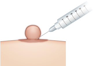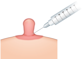 麻酔のクリームを塗った後、極細の注射針で、比較的感覚の鈍い乳頭基部から注射します。