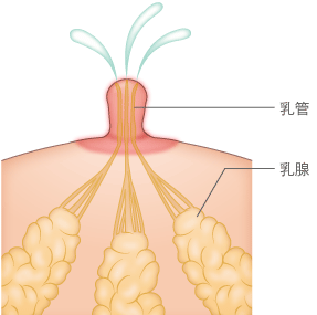乳腺で母乳が作られ、乳管を通り、乳頭の上部から母乳が出る。