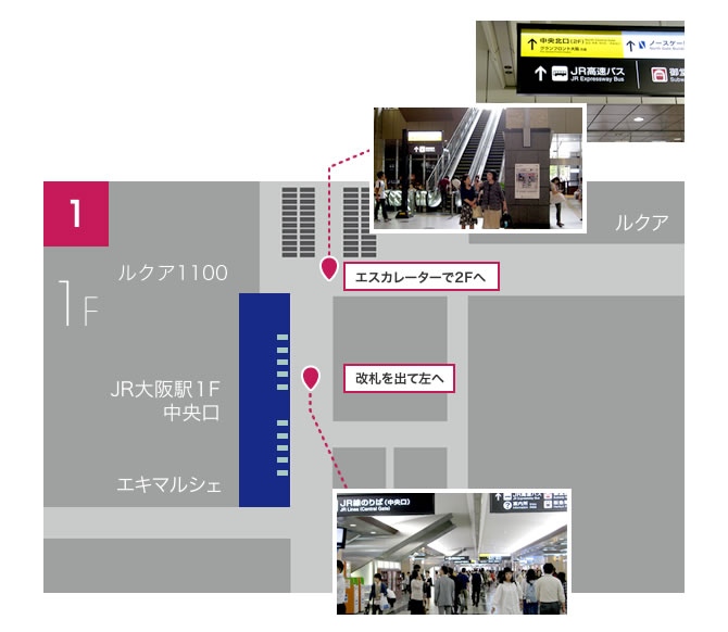 JR大阪駅1F中央口を出て左へ。エスカレーターで2Fへ上がる。