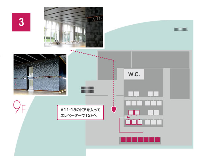 エレベーターを降りて左へ進みA11-18と表示のあるドアを入る。