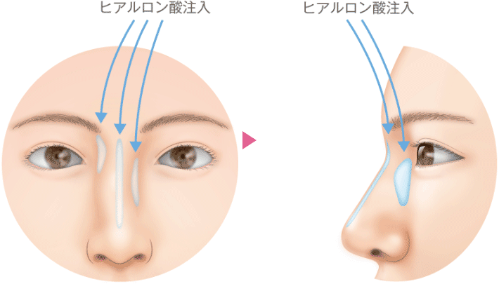 ある程度硬さのある長期持続型ヒアルロン酸で、左右対称に近づけると同時に高さを出すほうが、鼻筋が通りやすいです。