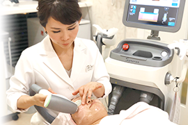 ほうれい線だけでなく、しみやしわ、毛穴も気になる方には、月に1度の<トリニティプラス/eプラス光照射&RFレーザー>の選択肢も。トラブルを総合的に整え、肌質を向上させていきます。ウルセラシステム焦点式(ハイフ)超音波システム顔全体 ¥440,000(税込) 高密度の焦点式(HIFU)超音波システムを用い、皮膚を支える筋肉層に直接アプローチ。筋肉を包んでいる筋膜に熱エネルギーを加えてぎゅっと引き締め、土台からたるみを引き上げます。施術は約30分でダウンタイムはなし。効果が徐々に出るため、周りに気づかれる心配がないのに1ヶ月後にはしっかりリフトアップ。「『痩せた?』と言われた」との感想も多い人気治療です。