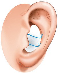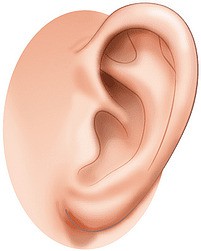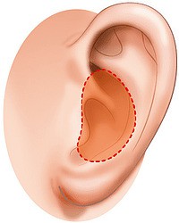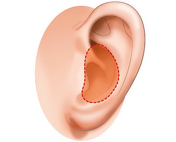 耳甲介(耳の真ん中の窪んでいる部分(赤枠内の部分))から軟骨を採取する