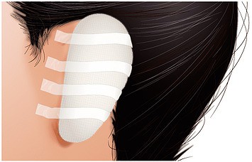 傷跡は細い糸で縫合し、耳甲介の軟骨を採った部分に血液が溜まらないように、軟膏ガーゼを約1週間詰め、表面をガーゼで覆います。