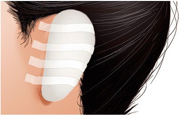 耳甲介の軟骨を採った部分に血液が溜まらないように、軟膏ガーゼを丸めて、枕固定する。