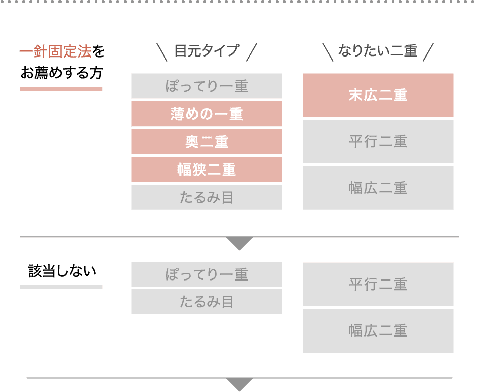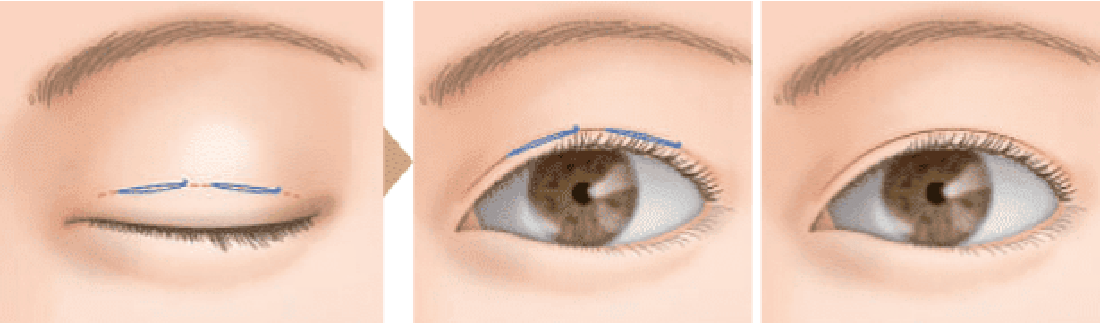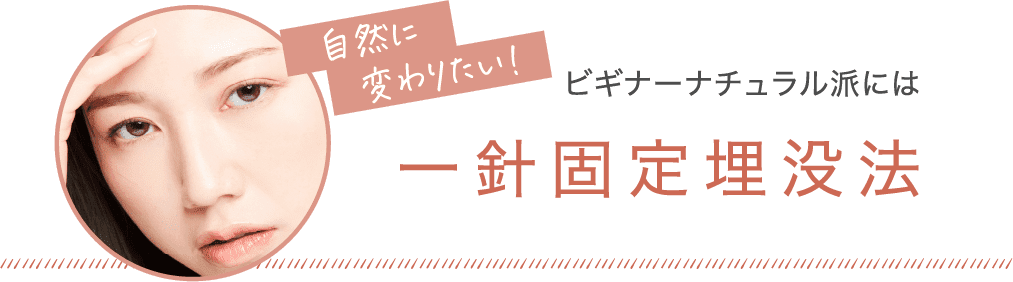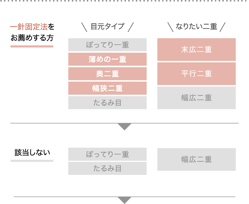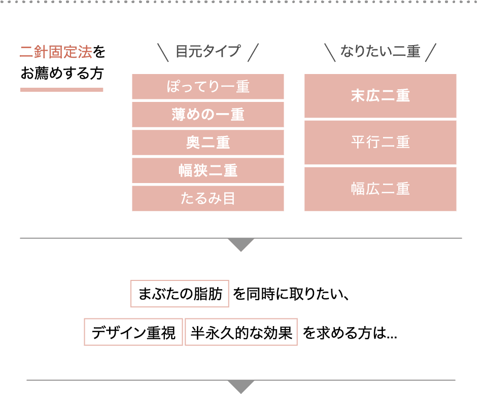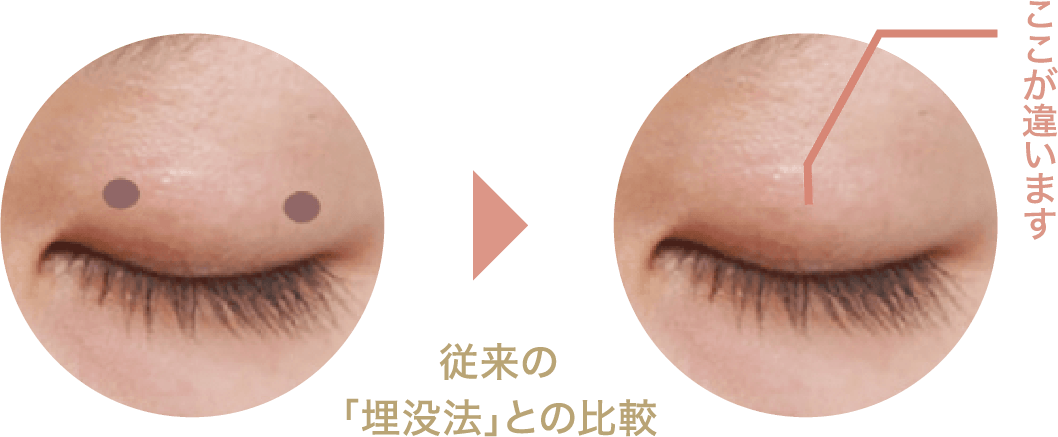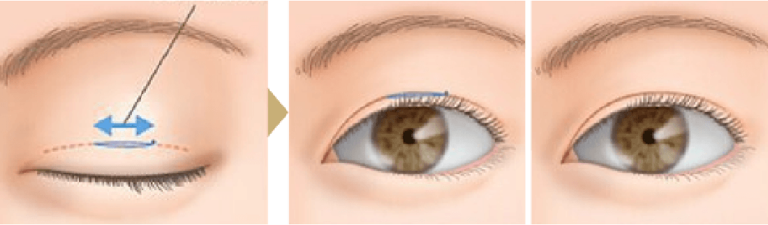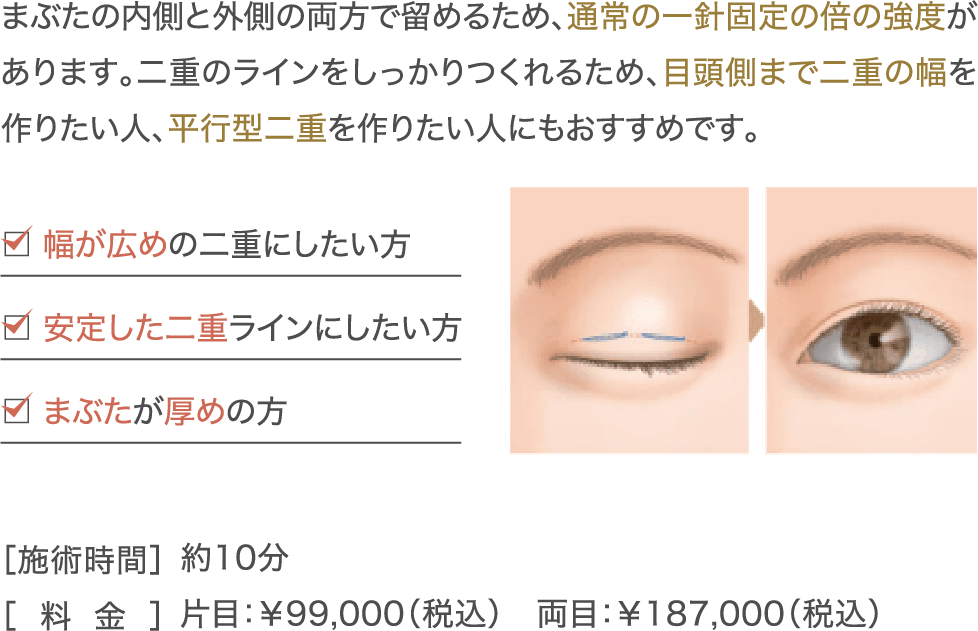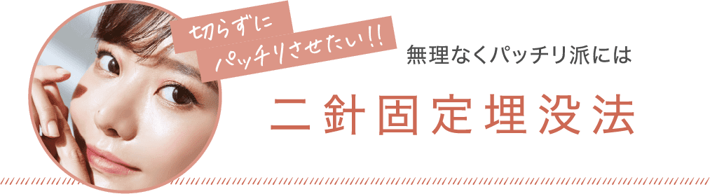 まぶたのたるみが多かったり、皮膚が厚い方の場合、一針固定法では糸が緩んで元に戻りやすいため、より強固に、安定した二重のラインを作ることができる二針固定法をご用意しています。で二重の幅を作りたい人、平行型二重を作りたい人にもおすすめです。