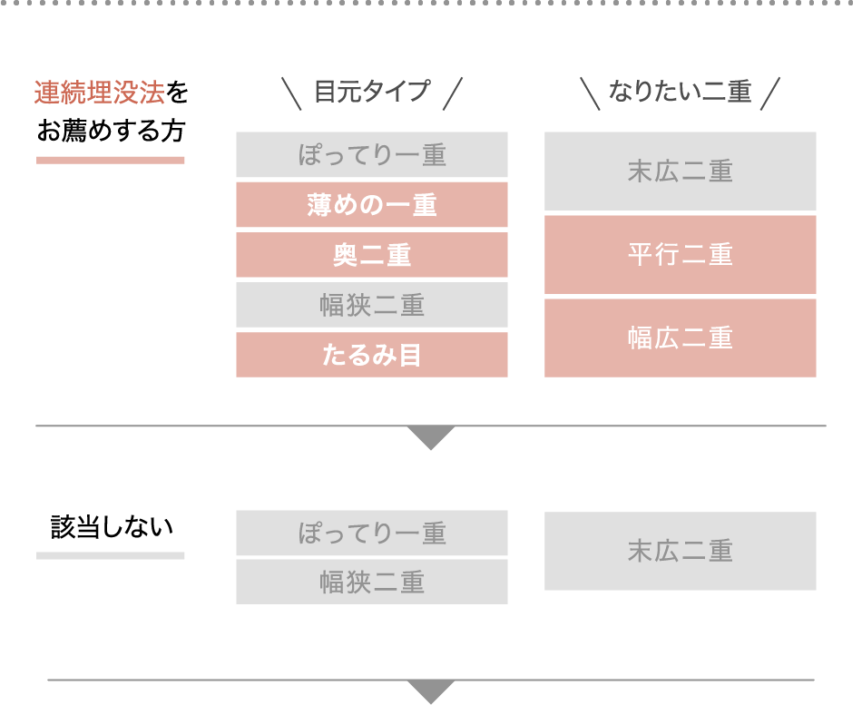 まぶた全体を留めていくので、さまざまなデザインが可能。そして、挙筋法でまぶたの上の方に留めていくので、たるみが出はじめている方で、「ダウンタイムが取れないので切開は避けたい」「まずは埋没でなんとかしたい」という方にもご提案いたします。