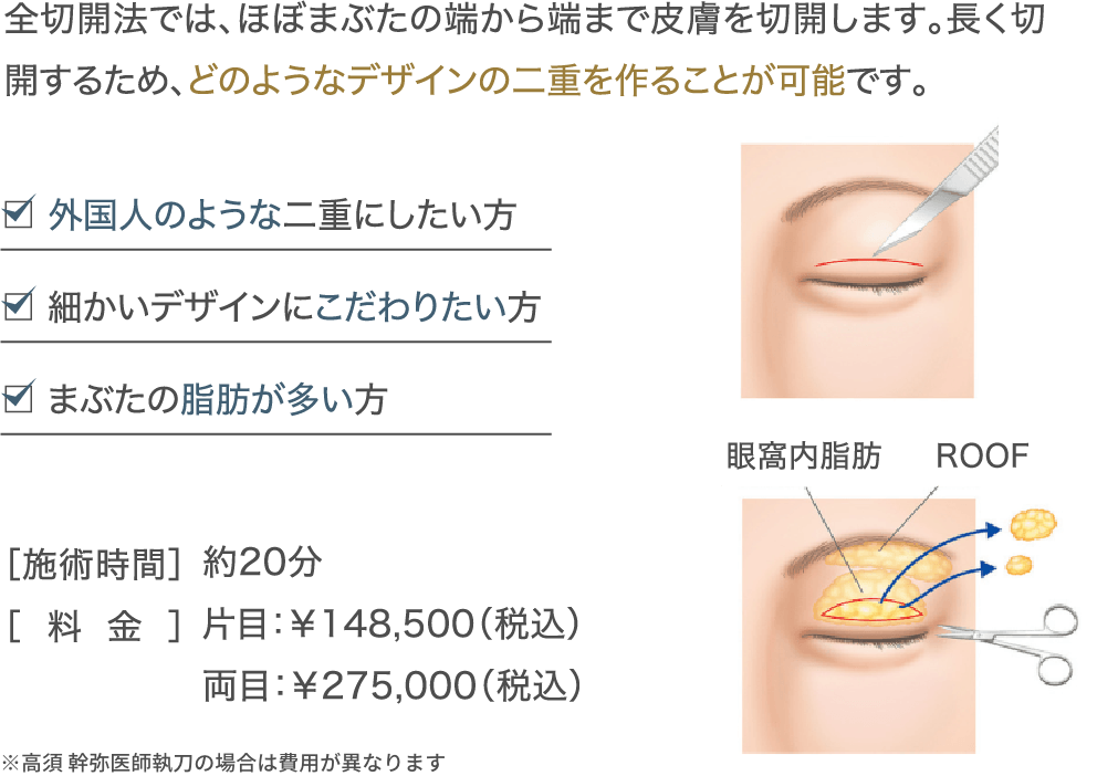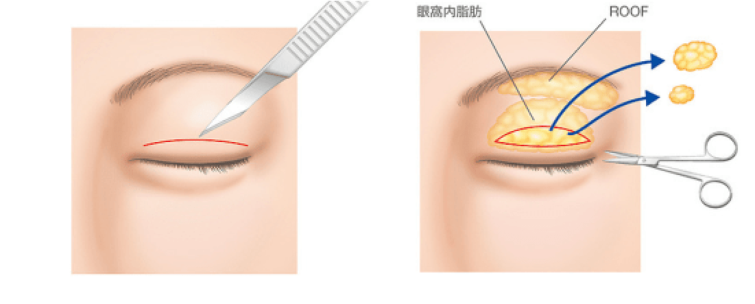 さらに全切開法では、上まぶたの脂肪(眼窩内脂肪とROOF)も同時に切除することができ、腫れぼったさを解消することができます。