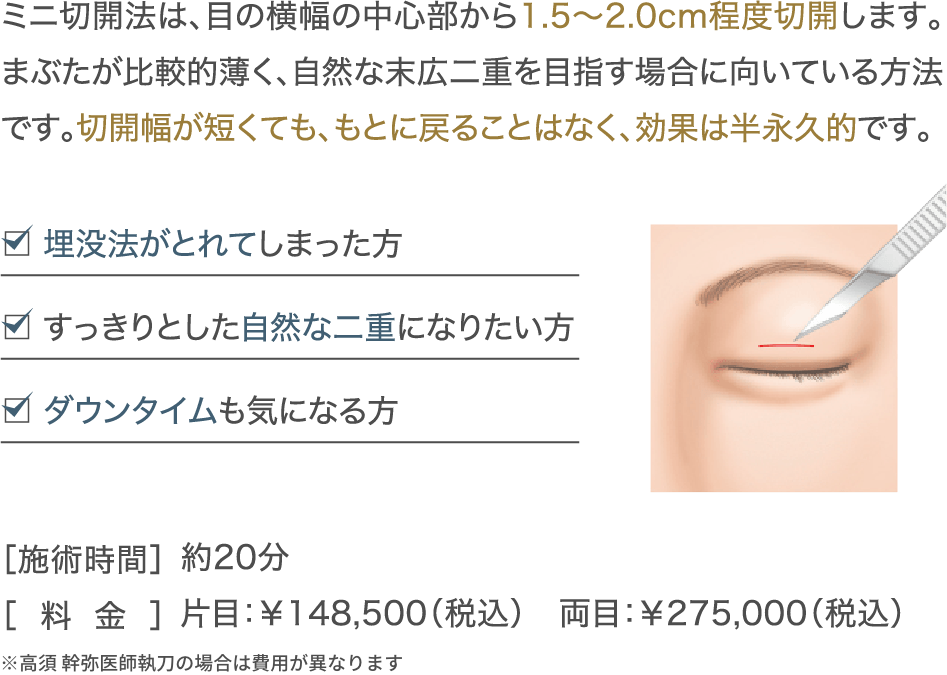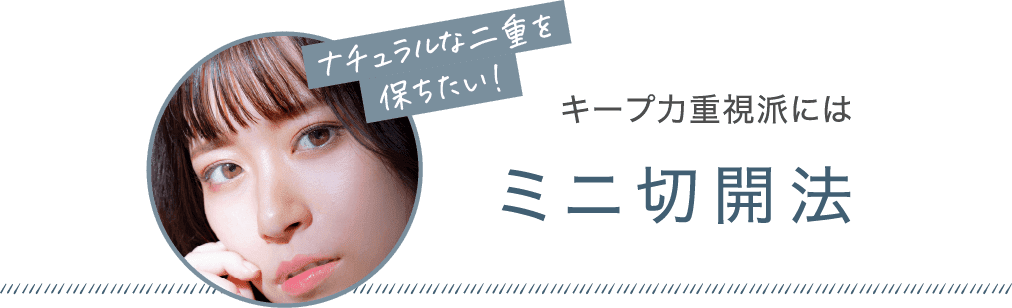 ミニ切開法は、目の横幅の中心部から1.5~2.0cm程度切開します。まぶたが比較的薄く、自然な末広二重を目指す場合に向いている方法です。切開幅が短くても、もとに戻ることはなく、効果は半永久的です。