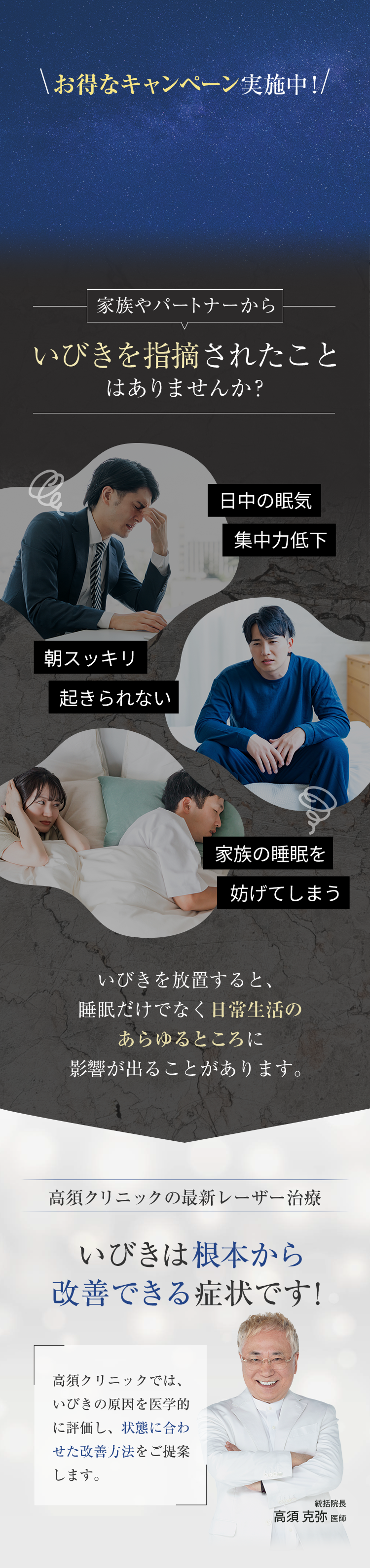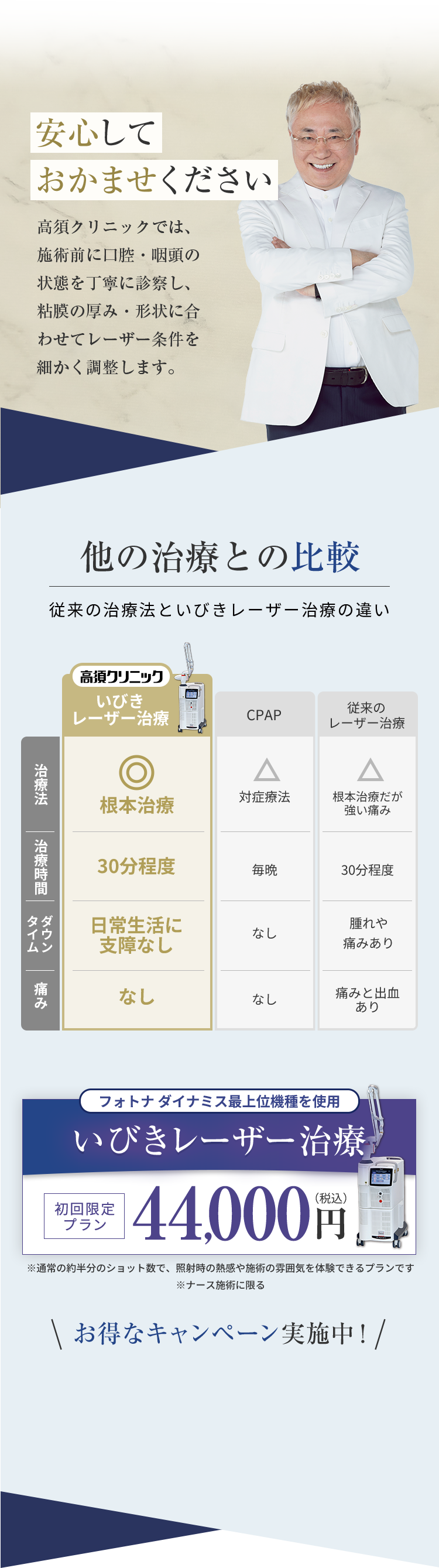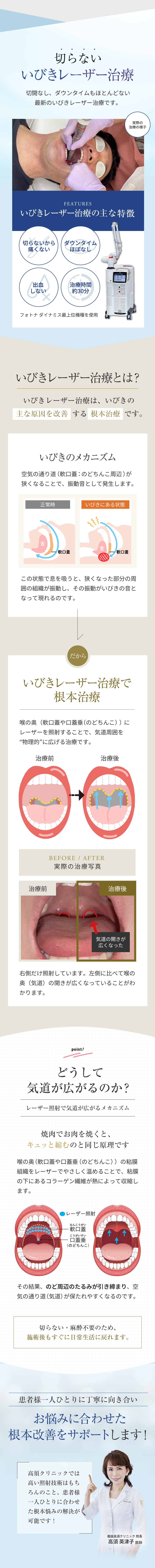 軟口蓋・咽頭の粘膜をレーザーで引き締めることで、【気道の狭さ × 粘膜の振動】といういびきの根本要因へアプローチします。