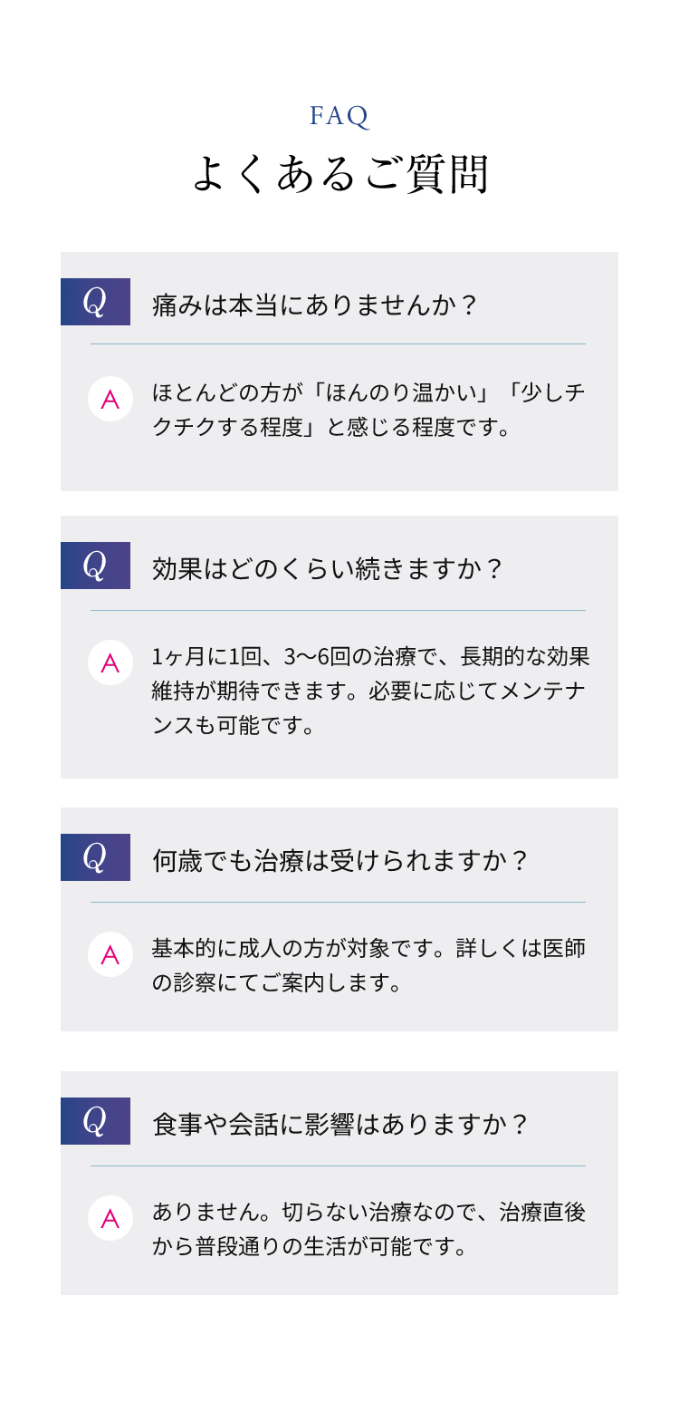 切開手術が不要で、麻酔の必要もありません。身体への負担が少ないため、施術後すぐに日常生活に戻れます。