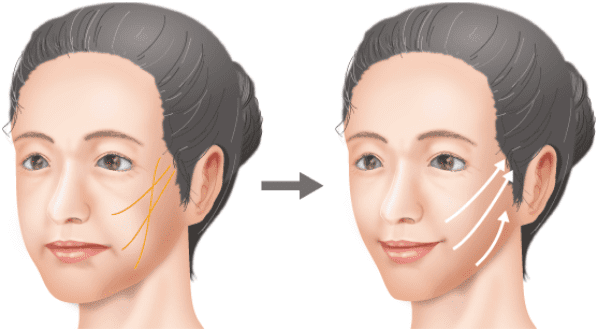 左右の頬からこめかみにかけて、イタリアンリフトの糸を3本ずつ、計6本挿入し、頬からフェイスラインのたるみを引き上げました。