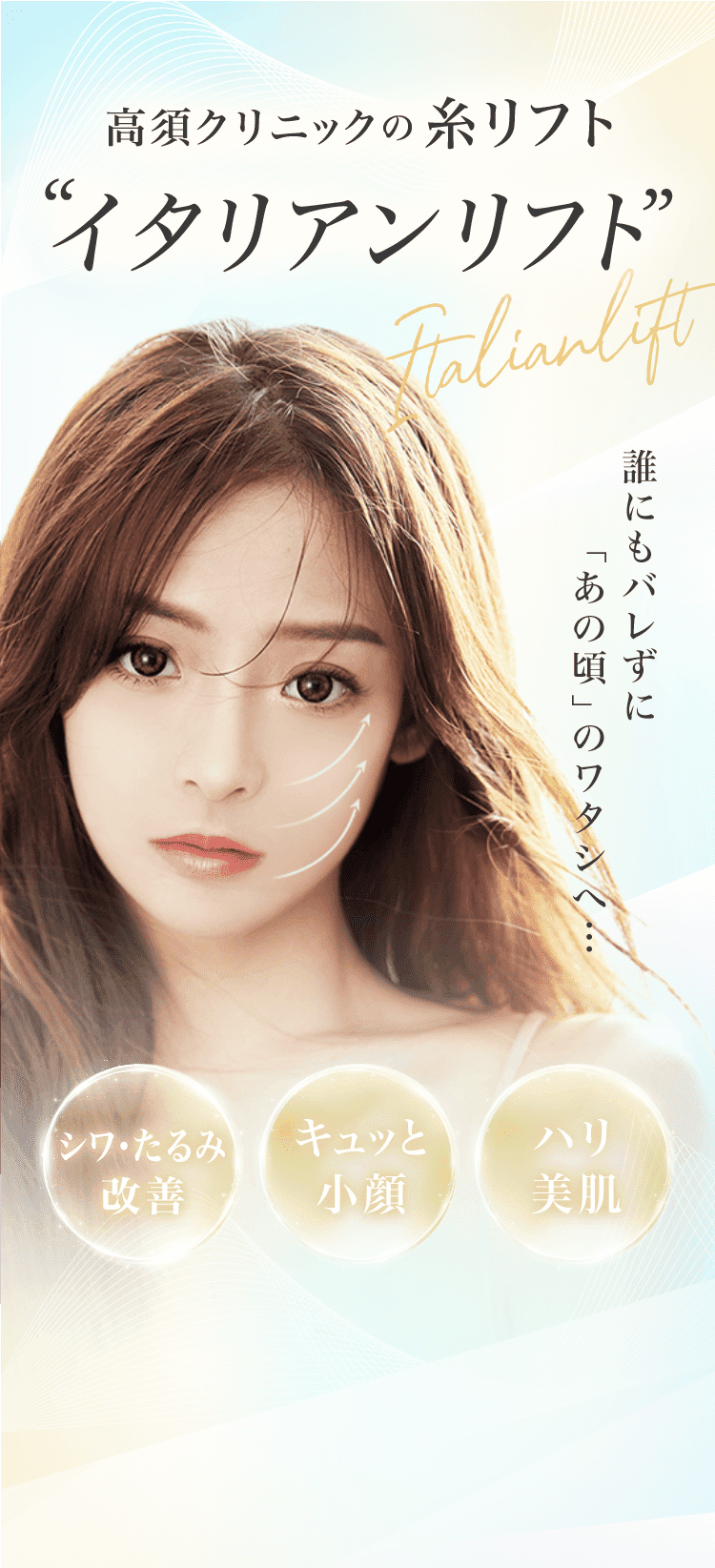 イタリアンリフトで頬のたるみをリフトアップし、イタリアンリフトファインで顔全体の肌の張りを出すようにしました。