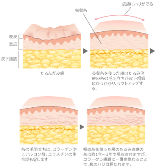 イタリアンリフトの糸は、挿入してから8~10ヶ月くらいで溶けて、溶けた部位に自己コラーゲン繊維が形成されます。