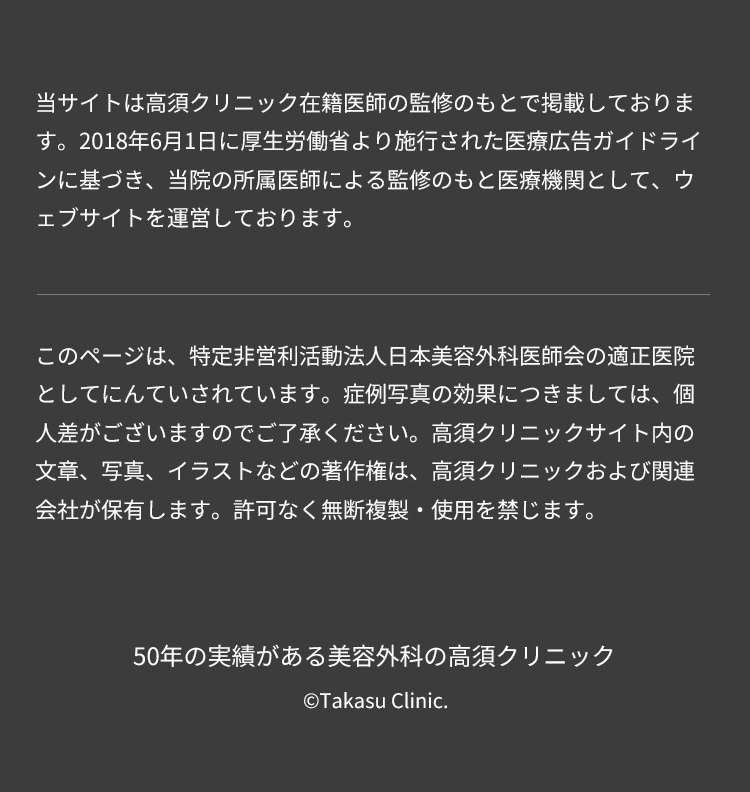お客様からご提供いただく個人情報については、高須クリニック事務局で適切な管理を行います。なお、管理は秘密保持契約を交わした上で当サービスの管理会社に委託します。また、委託先に対して、個人情報の適切な管理を徹底いたします。