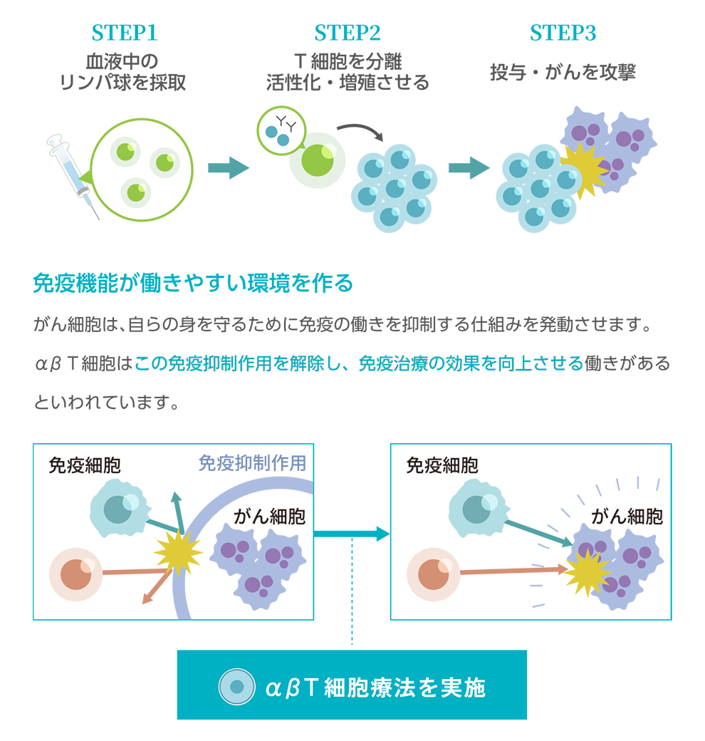 ![[STEP1]血液中のリンパ球を採取→[STEP2]T細胞を分離活性化・増殖させる→[STEP3]投与・がんを攻撃/【免疫機能が働きやすい環境を作る】がん細胞は、自らの身を守るために免疫の働きを抑制する仕組みを発動させます。αβT細胞はこの免疫抑制作用を解除し、免疫治療の効果を向上させる働きがあるといわれています。◎αβT細胞療法を実施](/operation/cancer_immunotherapy/images/item03_fr3_fig1.png)