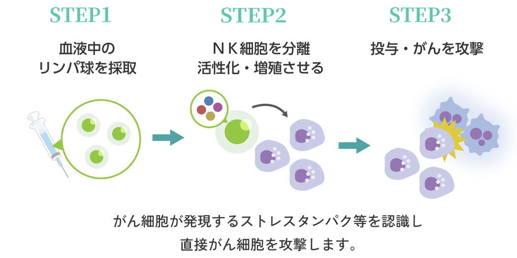 ![[STEP1]血液中のリンパ球を採取→[STEP2]NK細胞を分離活性化・増殖させる→[STEP3]投与・がんを攻撃/がん細胞が発現するストレスタンパク等を認識し直接がん細胞を攻撃します。](/operation/cancer_immunotherapy/images/item03_fr4_fig1.png)