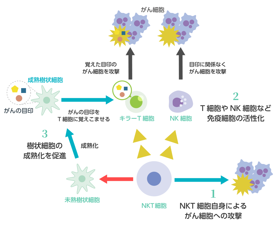 ![①[NKT細胞]NKT細胞自身によるがん細胞への攻撃 ②[NKT細胞]T細胞やNK細胞など免疫細胞の活性化 [NK細胞]目印に関係なくがん細胞を攻撃 [キラーT細胞]覚えた目印のがん細胞を攻撃 ③[NKT細胞]樹状細胞の成熟化を促進→[成熟樹状細胞]がんの目印をT細胞に覚えこませる](/operation/cancer_immunotherapy/images/item03_fr5_fig1.png)