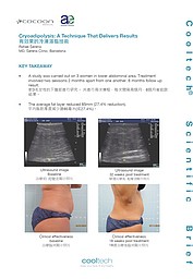 クールテック・ディファイン脂肪冷却痩身治療は、脂肪細胞を冷やしてシャーベット状に凍らせて、アポトーシス(細胞死)を起こさせて、脂肪細胞を減らしていく治療です。治療中の痛みや治療後のダウンタイムや痛みがほとんどないことも特徴のひとつです。症例写真からも見てわかるように、段々になっているおなか周りも、施術後はすっきりしています。