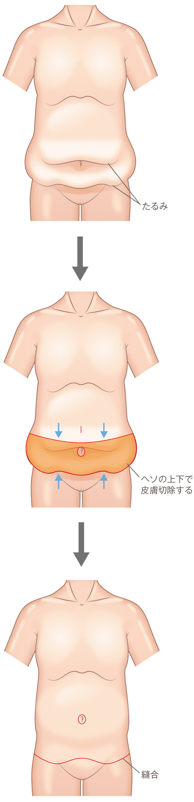 お腹のたるみ取り手術は、お腹周りの余分な皮膚を切除し、縫合します。