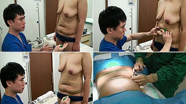 鼠径部辺りで皮膚を切開して、胸の下辺りまで皮下剥離し、皮膚を下(尾側)に引っ張った状態で、余分な皮膚を、縦方向と横方向で切除して、縫合します。