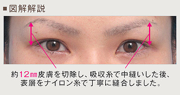まゆ毛のすぐ下にある厚いまぶたの皮膚だけを切除し、下の薄い皮膚は残して縫い縮めるため、目のラインやまぶたをすっきりさせることができます。
