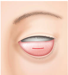 下まぶたの裏側の粘膜(結膜)を小さく切開するだけで、表面の皮膚を傷つけず、傷跡がお顔に目立つことはありません。