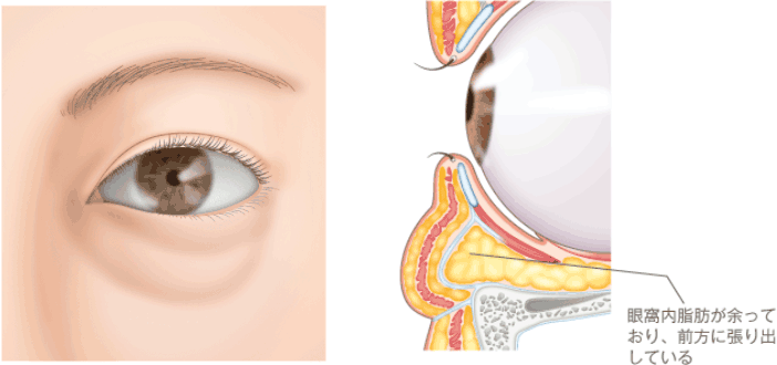 これは、笑顔の表情を作ることにより頬が挙がり、目の周りの筋肉が収縮することによって眼窩内圧が高まり、下まぶたの残っている眼窩内脂肪が前方に張り出すことによって生じます。