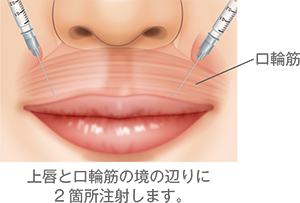 ボツリヌストキシンを、口周りの筋肉(口輪筋)に注入します。