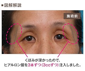 この方はくぼみが深かったので、ヒアルロン酸を3本ずつ(3ccずつ)注入しました。くぼみがもう少し浅い方だったら1~2本で十分なことが多いです。くぼみを完全に平らにしなくても、深いくぼみを少し浅くするだけでも十分印象は変わりますので1~2本くらい注入する方も多いです。ヒアルロン酸注入は痛みはごくわずかですし、腫れはほとんどでません。高須クリニックのヒアルロン酸は長期持続タイプのものを使用しているので、2~3年程度で吸収されていきます。こめかみのくぼみが目立たなくなると、若くみられたり、元気にみられたりしますね。ヒアルロン酸以外にこめかみを膨らませる方法は、シリコンプロテーゼを入れる方法と脂肪吸引した脂肪を注入する方法がありますが、どちらも多少の腫れとダウンタイムを要しますので、現在はヒアルロン酸でされる方が多いです。