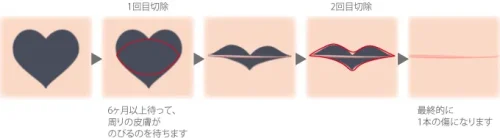 切除縫縮は、タトゥーがある部分の皮膚を切って縫い、一本の傷にして除去する方法です。幅が広い入れ墨の場合は、以下の図のように複数回に分けて切除する「分割式切除(シリアルエキシジョン)」を行います。