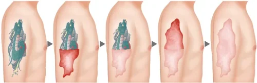 傷跡が目立ちにくい太ももや背中などから皮膚を切り取り、その皮膚をタトゥーがある部分に移植して塞ぐ方法もあります。皮膚移植は、面積が広いタトゥーや、赤や黄色といったレーザーに反応しにくい色のタトゥーを除去するのにおすすめです。
