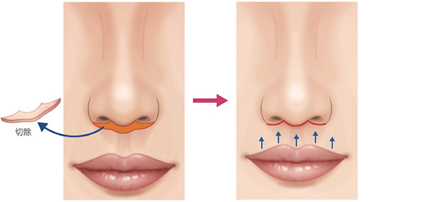 この手術は、鼻の下の余分な皮膚を物理的に切除し、縫い合わせることで、絶対的に鼻の下を短縮し、上唇を上に引き上げる効果があります。余分な皮膚を取り除くため、確実に短くなることが最大の特長です。