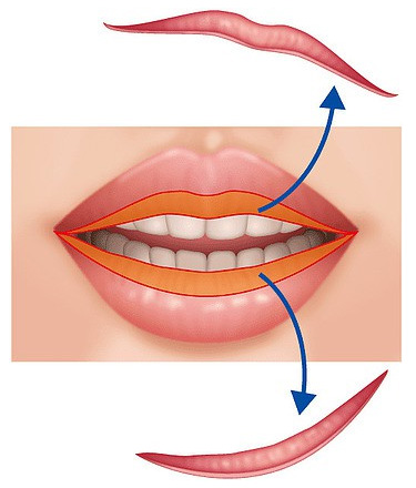 唇を薄くする手術(口唇縮小術)は、通常、局所麻酔をして、唇の濡れている部分と乾いている部分の境目を切開し、粘膜とその下の組織を切除して縫合します。基本的に、口の動きを司る口輪筋という筋肉には手をつけないようにしています。